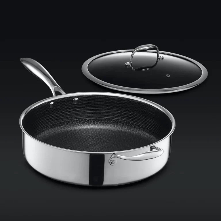 The HexClad Hybrid Nonstick 5.5-Qt Deep Sauté Pan features a unique hexagonal…