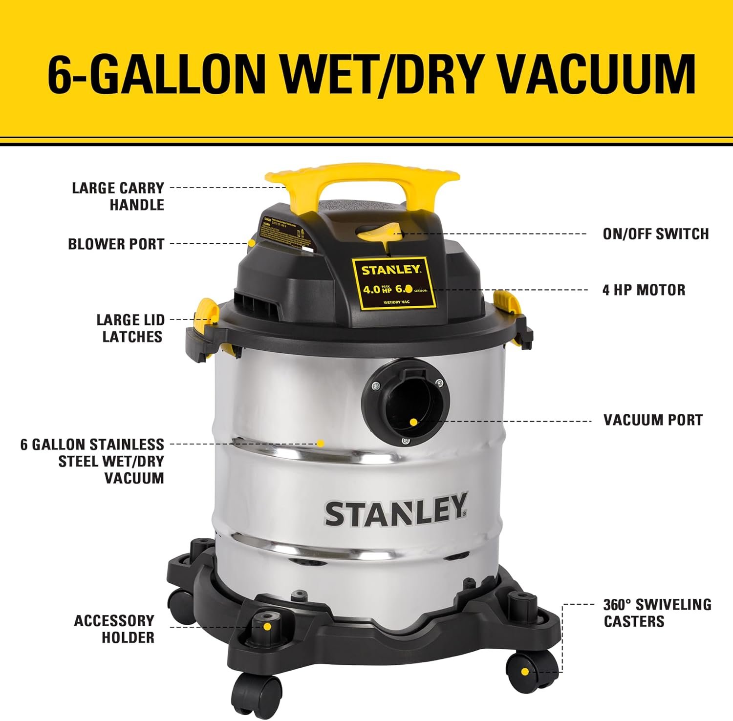 Wet Vacuum: STANLEY SL18116 Wet/Dry Vacuum, 6 Gallon, 4 Horsepower, Stainless Steel Tank, 4.0 HP, Silver+Yellow