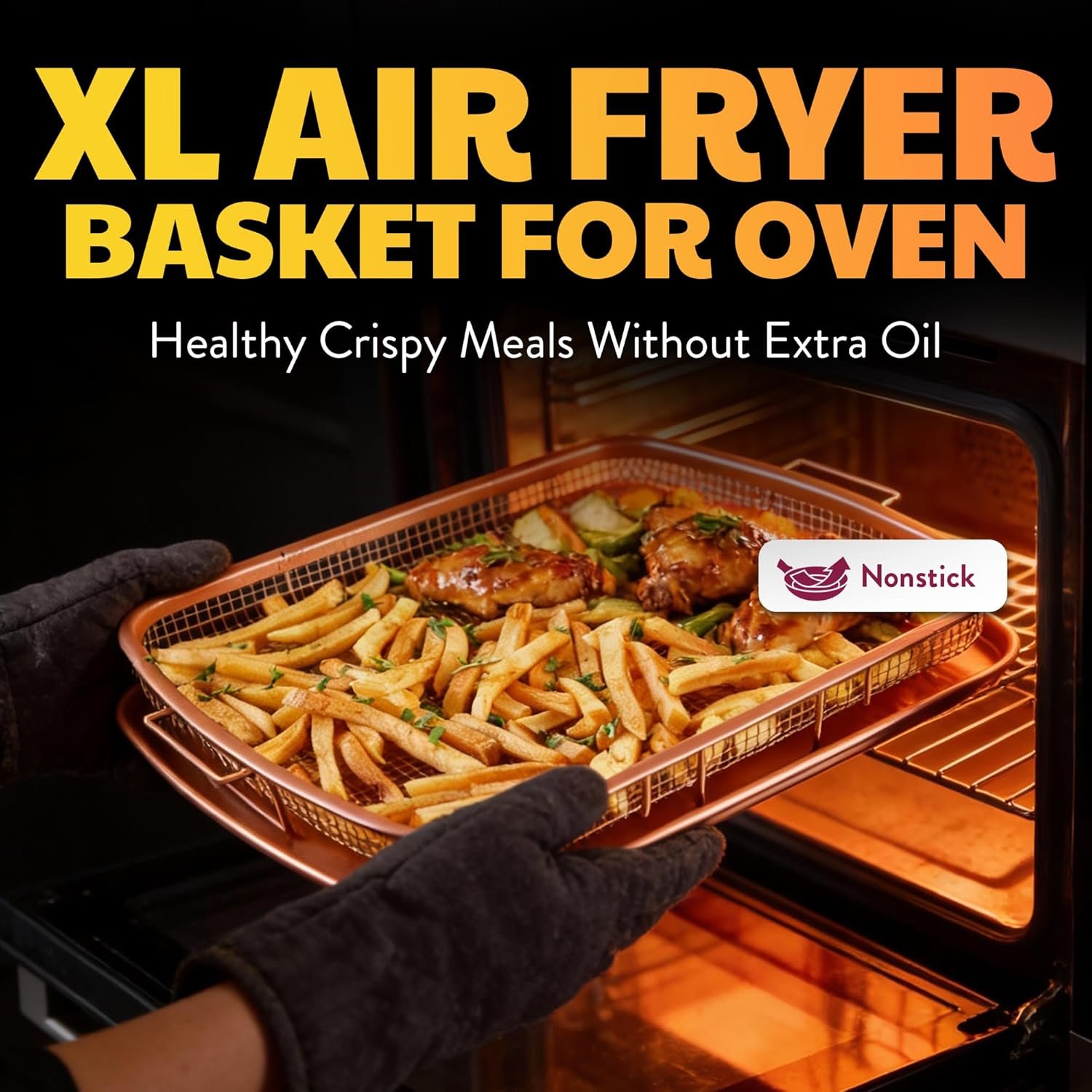This model stands out for its generous XXL basket and durable copper coating—a step above many standard brands. It undercuts the Wilton Mega Baking Pan on price, while offering easier cleanup than the typical mesh racks found in most air fryer ovens. Compared to the Nordic Ware Oven Crisper Pan, it boasts a roomier oven basket and a true non-stick pan design, making it a more versatile option for kitchens prioritizing healthy frying and convenience.