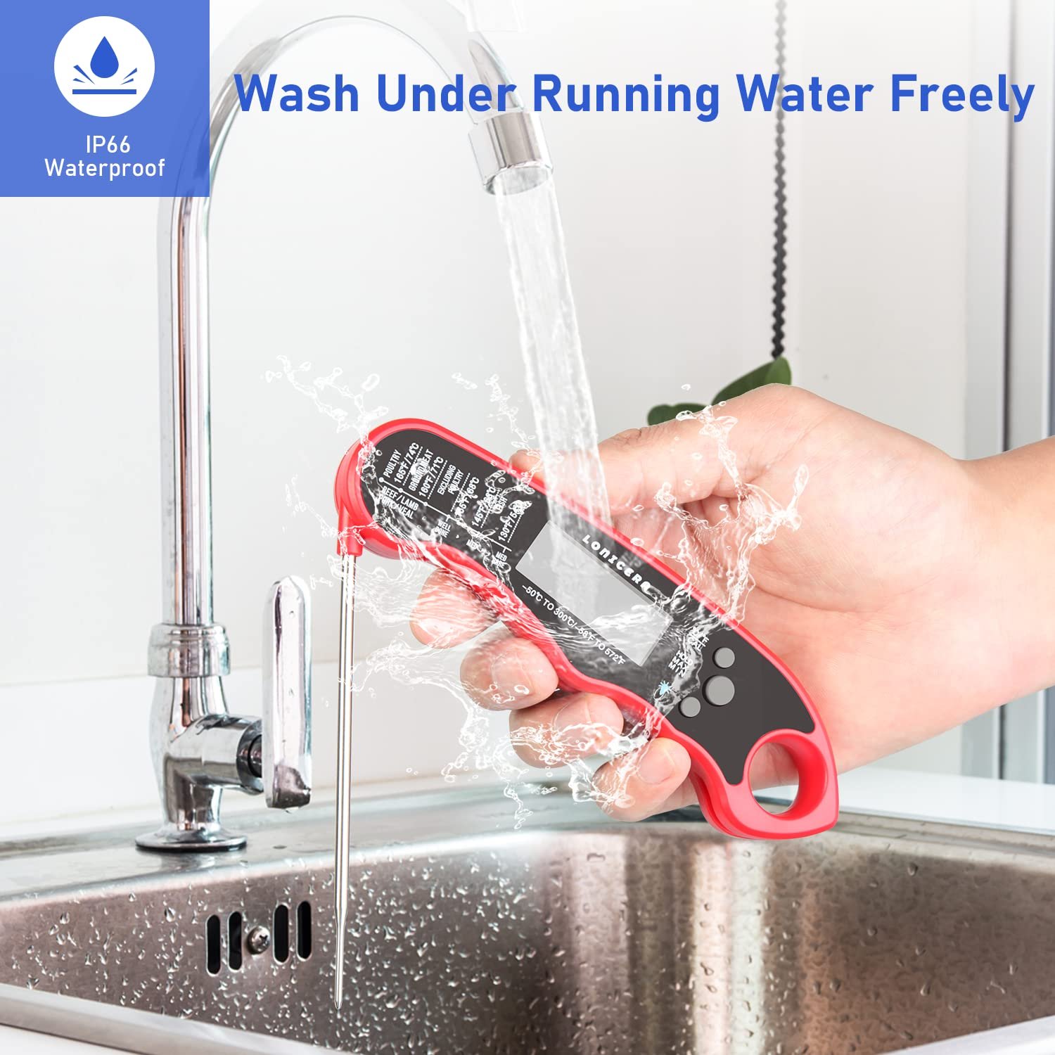 The IP66 waterproof housing allows the thermometer to be safely rinsed under water without worrying about splash damage. Its wide temperature range –58°F to 572°F (–50°C to 300°C) covers everything from chilled liquids to deep-frying.