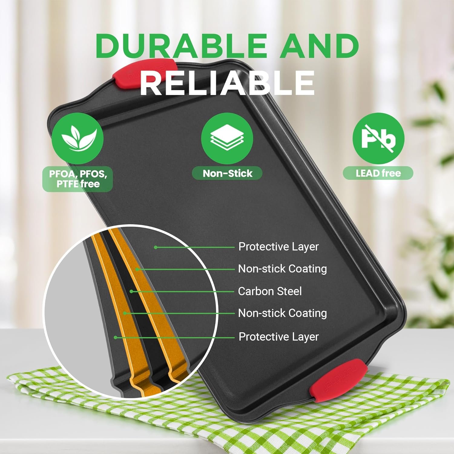 • Commercial Grade Carbon Steel: Delivers excellent heat conduction for restaurant quality baking, while resisting warping through frequent use.
